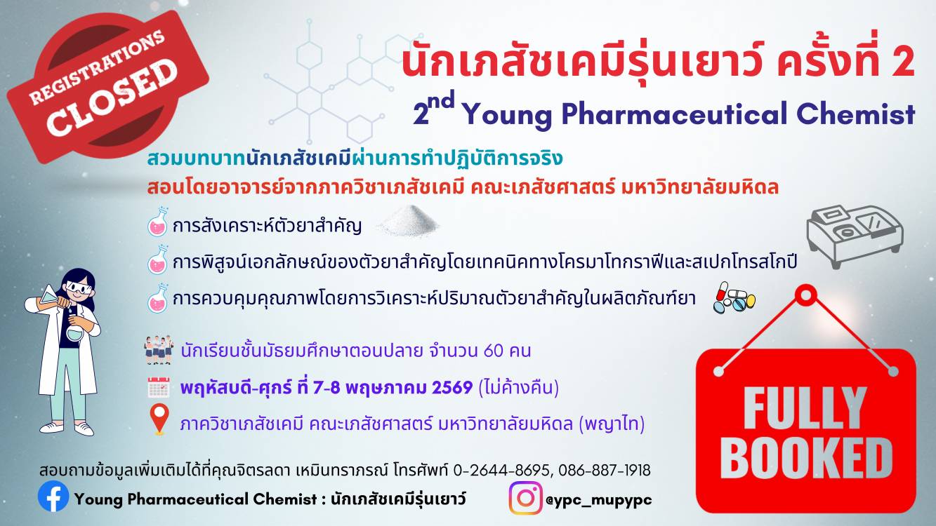 อาชีพเภสัชกรเป็นหนึ่งในอาชีพในฝันของเยาวชนไทย จึงทำให้คณะเภสัชศาสตร์เป็นหนึ่งในคณะที่นักเรียนในระดับมัธยมศึกษาตอนปลายให้ความสนใจเข้าศึกษาต่อในระดับอุดมศึกษาเป็นอย่างมาก โดยเฉพาะคณะเภสัชศาสตร์ มหาวิทยาลัยมหิดล ที่ได้รับความนิยมอยู่ในลำดับต้นๆ เนื่องจากเป็นแหล่งผลิตเภสัชกรเข้าสู่ระบบสาธารณสุขของประเทศไทยมากว่า 50 ปี การเรียนในคณะเภสัชศาสตร์นั้นเป็นการเรียนรูปแบบบูรณาการความรู้และทักษะปฏิบัติการจากหลากหลายสาขาวิชาเข้าด้วยกัน หนึ่งในนั้นคือสาขาวิชาเภสัชเคมี (Pharmaceutical Chemistry) ที่มีความสำคัญต่อวิชาชีพเภสัชกรรม ทั้งเภสัชกรรมบริบาลและเภสัชกรรมอุตสาหการ เพื่อให้นักเรียนระดับมัธยมศึกษาตอนปลายรู้จัก เข้าใจและสัมผัสกับวิชาชีพเภสัชกรรม โดยเฉพาะอย่างยิ่งด้านการผลิตและการควบคุมคุณภาพของวัตถุดิบทางยา ทางภาควิชาเภสัชเคมี คณะเภสัชศาสตร์ มหาวิทยาลัยมหิดล จึงได้จัดทำโครงการนักเภสัชเคมีรุ่นเยาว์ (Young Pharmaceutical Chemist) ขึ้น โดยนักเรียนที่เข้าร่วมโครงการจะได้ทราบข้อมูลเกี่ยวกับการเรียนในคณะเภสัชศาสตร์และความเข้าใจในวิชาชีพเภสัชกรรมมากขึ้น นักเรียนจะได้ฝึกปฏิบัติการในการสังเคราะห์ตัวยาสำคัญ (Active Pharmaceutical Ingredient รายละเอียดงานประชุม | รายชื่อผู้เข้าร่วมประชุม | สมัคร Online |