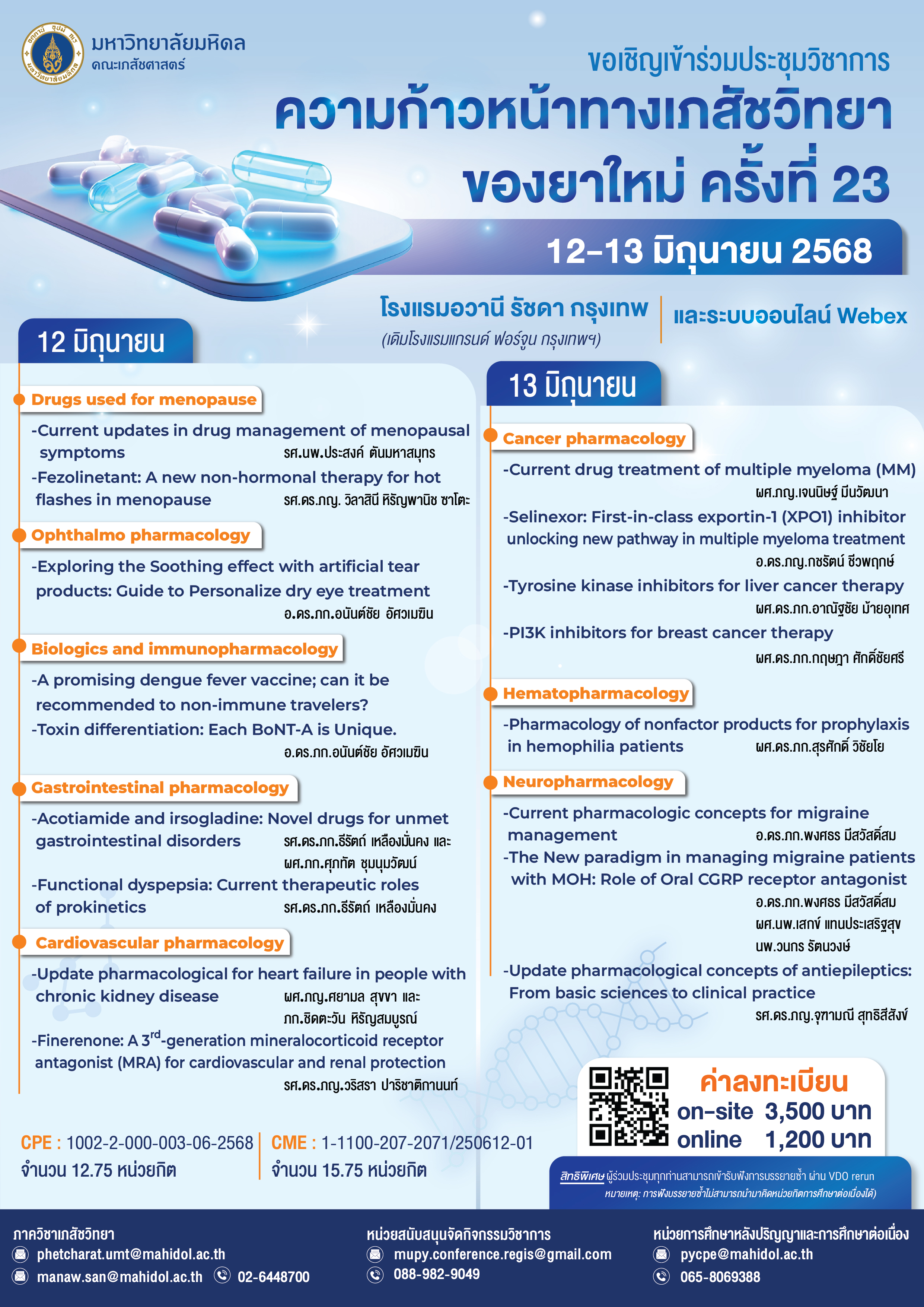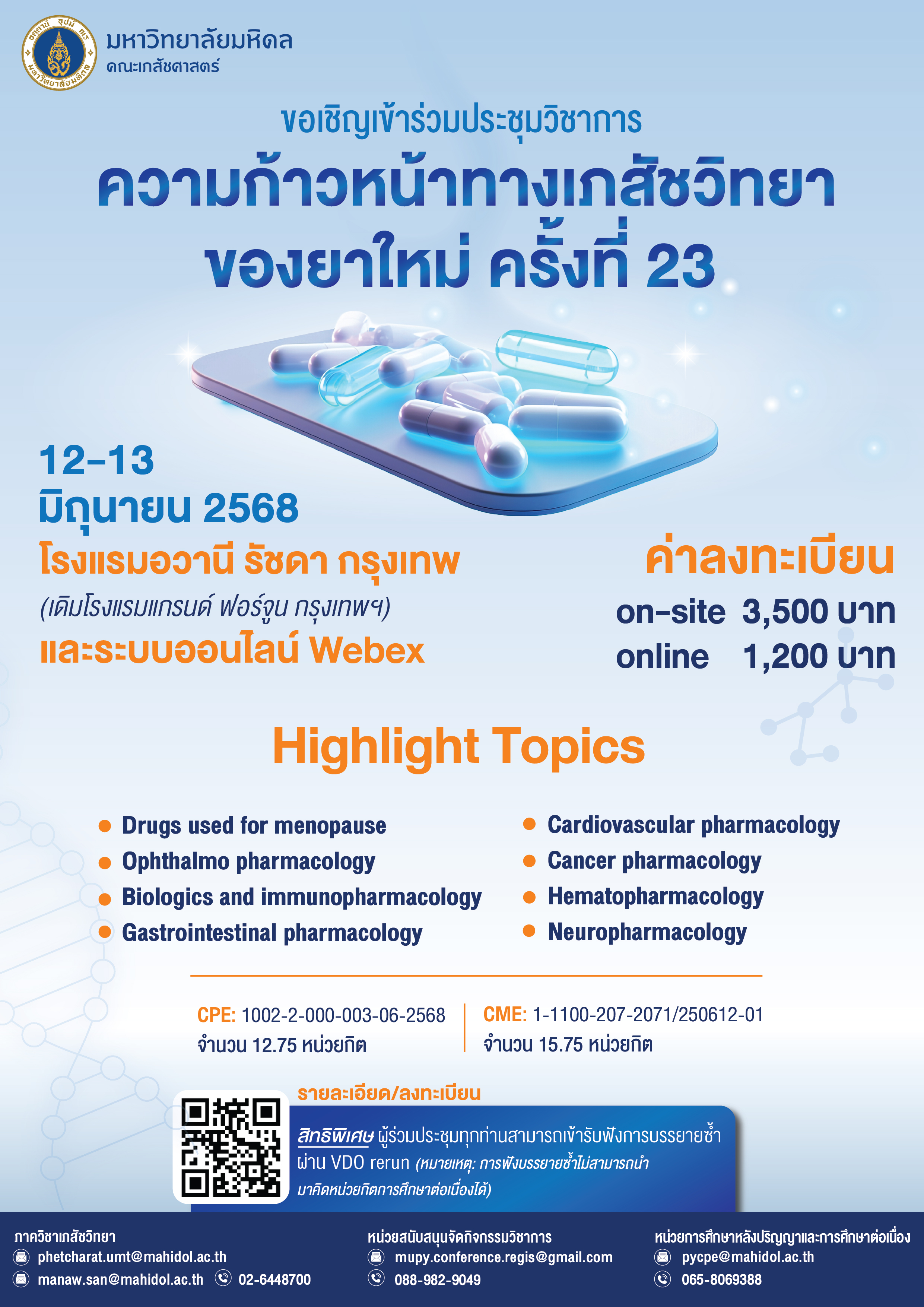 E-mail:ภาควิชาเภสัชวิทยา คณะเภสัชศาสตร์ มหาวิทยาลัยมหิดล โทรศัพท์สายตรง: 02-6448700 E-mail: phetcharat.umt@ma โทรศัพท์ :หน่วยสนับสนุนการจัดกิจกรรมวิชาการ โทร.02-3543517 E-mail: mupy.conference.regis@gmail.com