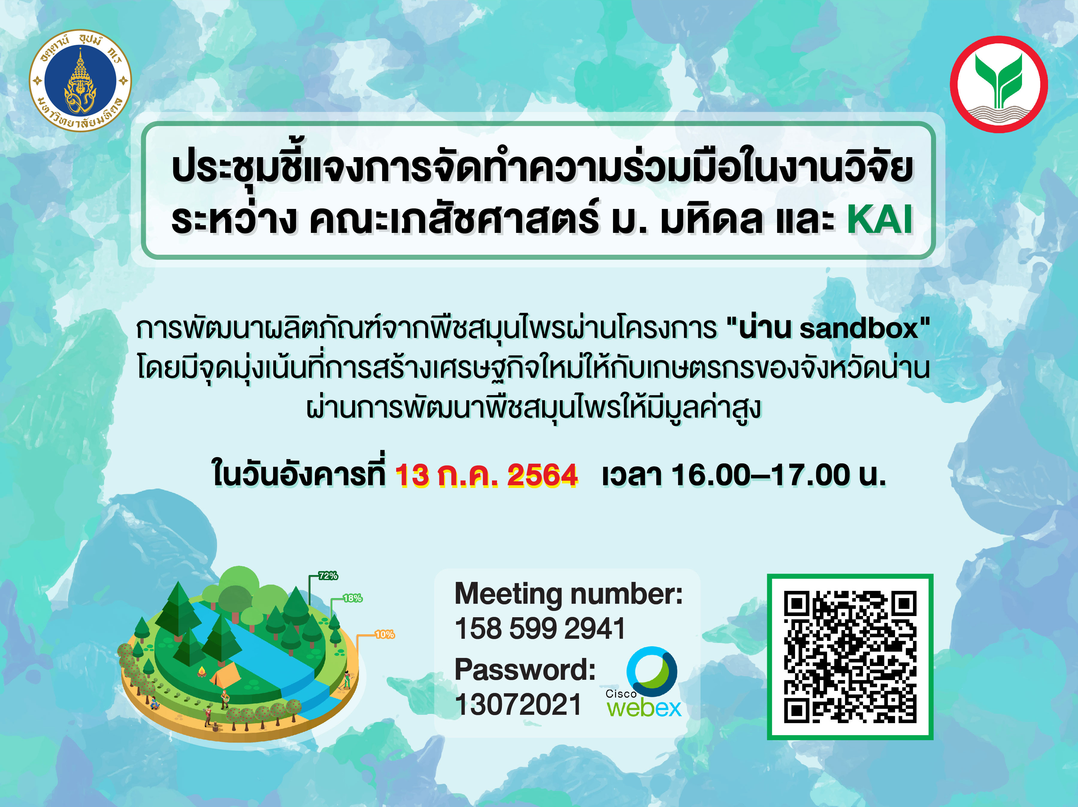 ![]() | การประชุมชี้แจงการจัดทำความร่วมมือในงานวิจัยระหว่าง คณะเภสัชศาสตร์ ม.มหิดล และ KAI (13 ก.ค. 2564, 16.00-17.00 น.) | ![]() | ![]() | ![]() |