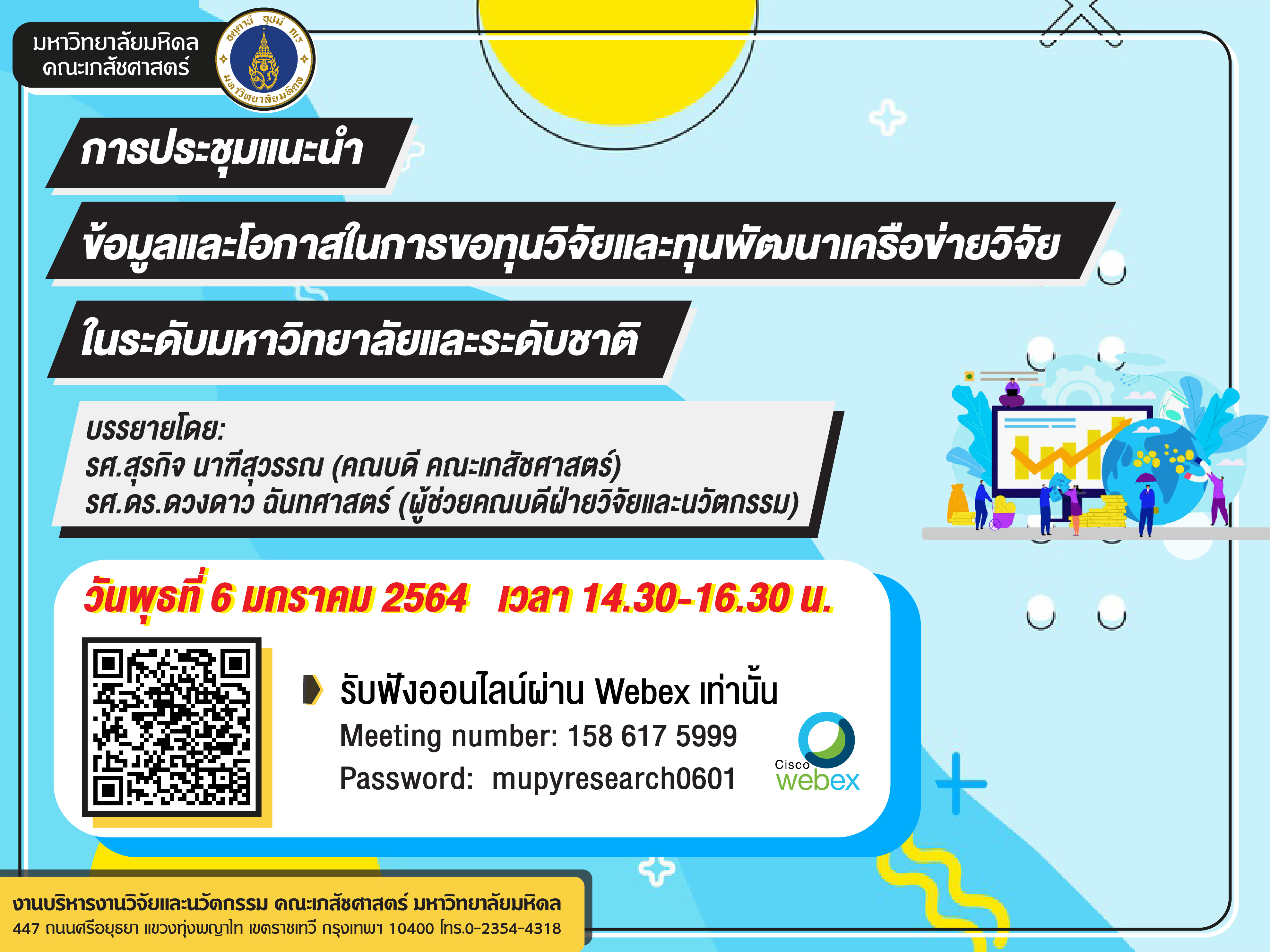 ![]() | งานประชุมแนะนำข้อมูลและโอกาสในการขอทุนวิจัยและทุนพัฒนาเครือข่ายวิจัยในระดับมหาวิทยาลัยและระดับชาติ (6 ม.ค. 2564, 14.30-16.30 น.) | ![]() | ![]() | ![]() |