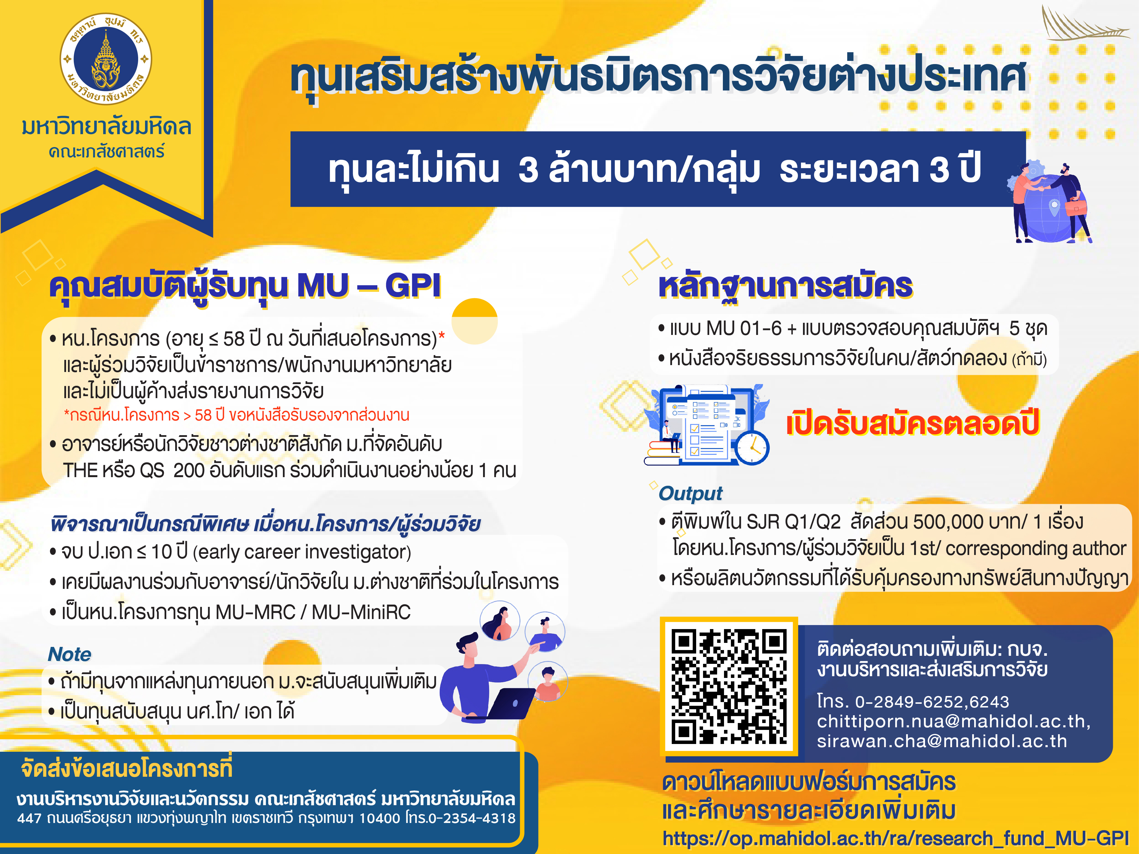 ประชาสัมพันธ์ ทุนเสริมสร้างพันธมิตรการวิจัยต่างประเทศ (Mahidol University - Global Partnering Initiative: MU – GPI) ปี 2564