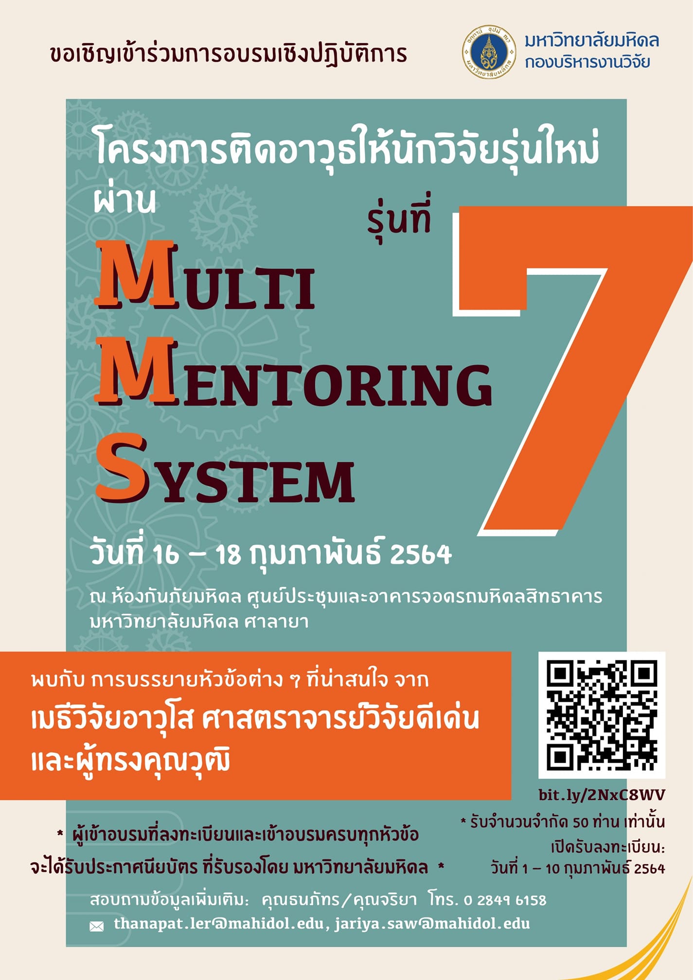 ![]() | การอบรมเชิงปฏิบัติการโครงการติดอาวุธให้นักวิจัยรุ่นใหม่ผ่าน Multi Mentoring System (MMS) รุ่นที่ 7 (16-18 ก.พ. 2564) | ![]() | ![]() | ![]() |