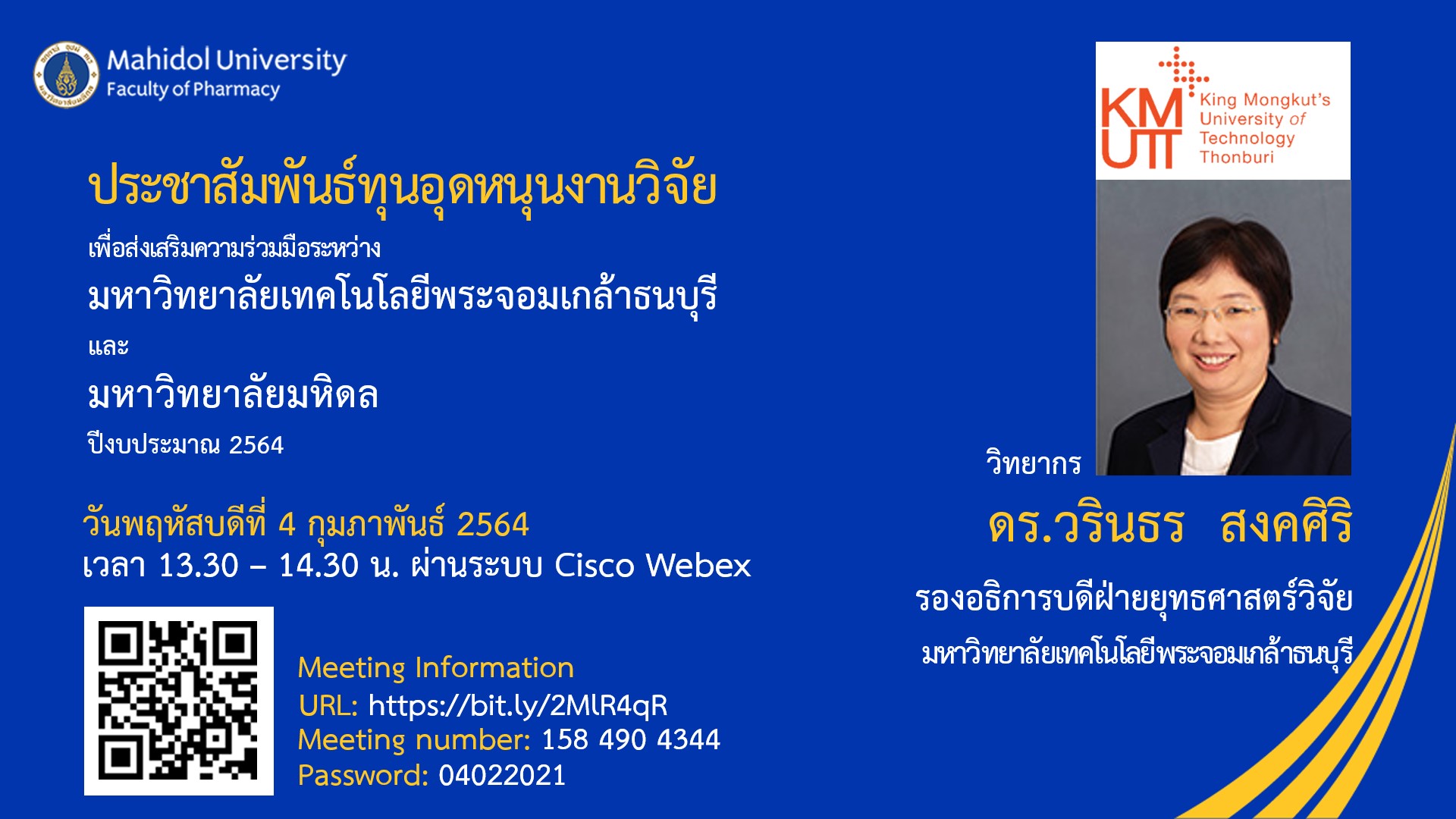 ![]() | งานประชาสัมพันธ์ทุนอุดหนุนงานวิจัยเพื่อส่งเสริมความร่วมมือระหว่าง ม.เทคโนโลยีพระจอมเกล้าธนบุรี และ ม.มหิดล ปีงบประมาณ 2564 (4 ก.พ. 2564, 13.30-14.30 น.) | ![]() | ![]() | ![]() |