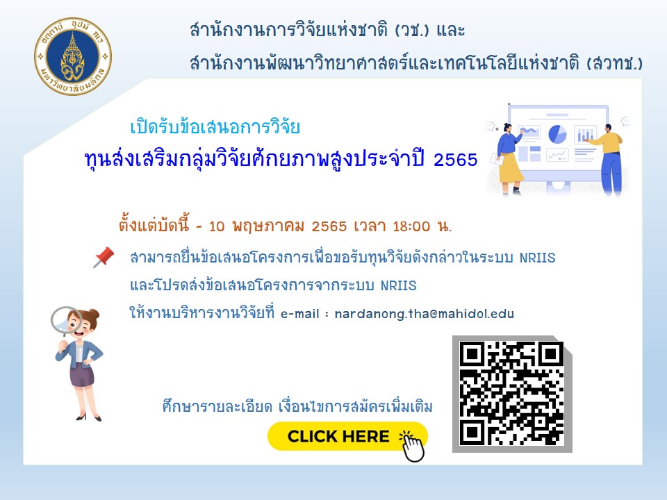 ประชาสัมพันธ์ทุนส่งเสริมกลุ่มนักวิจัยศักยภาพสูงประจำปี 2565Created by สุดารัตน์ กองแก้ว เปิดดูแล้ว 103 ครั้ง |