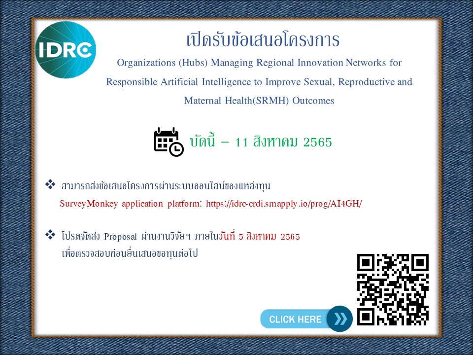 ประชาสัมพันธ์ทุนวิจัย Organizations (Hubs) Managing Regional Innovation Networks for Responsible Artificial Intelligence to Improve Sexual, Reproductive and Maternal Health(SRMH) OutcomesCreated by สุดารัตน์ กองแก้ว เปิดดูแล้ว 125 ครั้ง Preview |