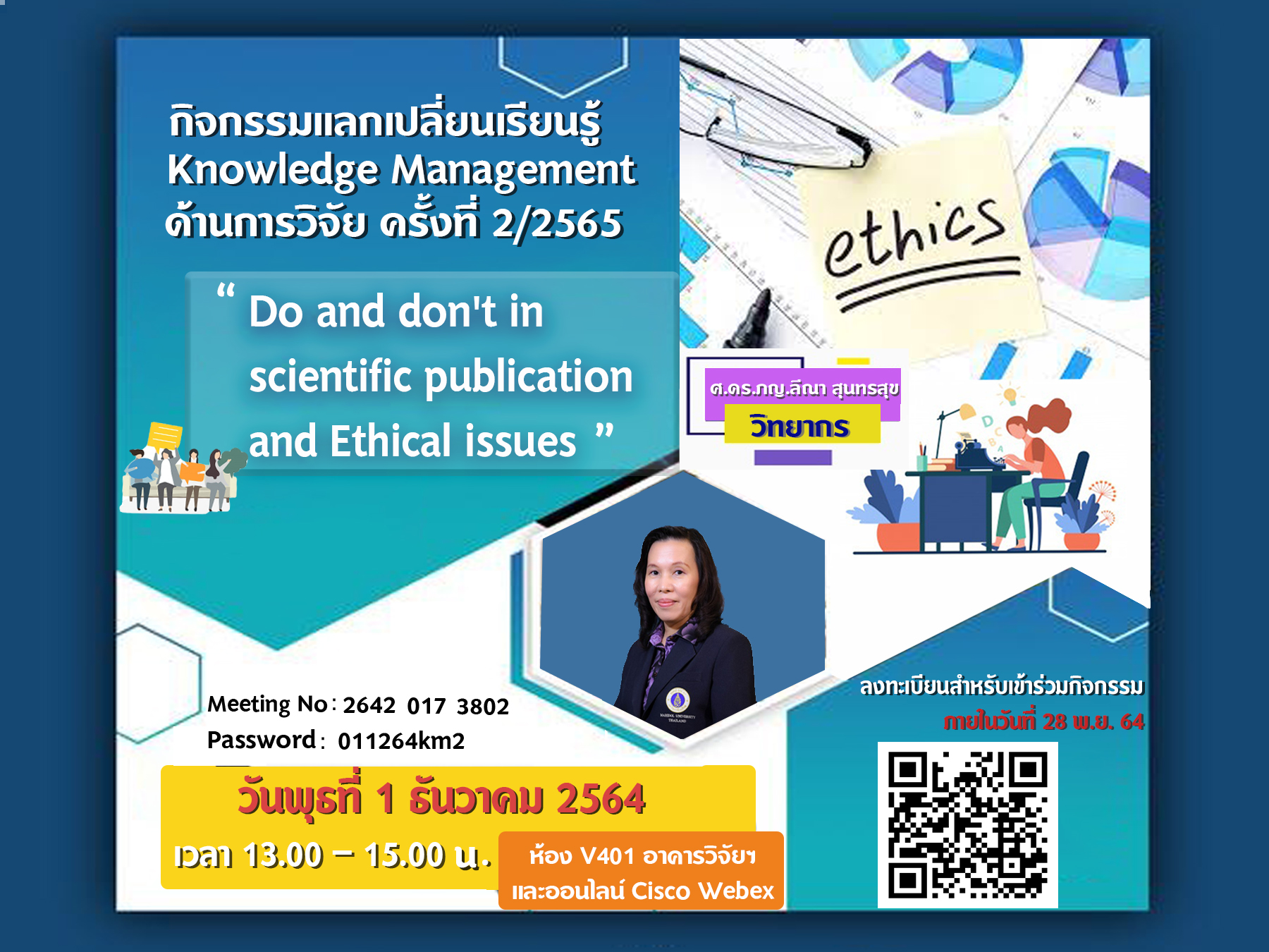 ![]() | KM ด้านการวิจัย ครั้งที่ 2/2565 “Do and do not in scientific publication and Ethical issues” (1 ธ.ค. 2564, 13.00-15.00 น.) | ![]() | ![]() | ![]() |