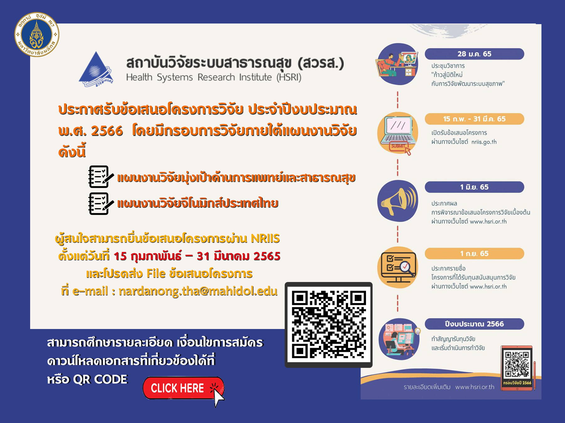 ประชาสัมพันธ์ สวรส.เปิดรับข้อเสนอโครงการวิจัย ประจำปีงบประมาณ 2566Created by พุชิตา พึ่งฉิม เปิดดูแล้ว 134 ครั้ง Preview |